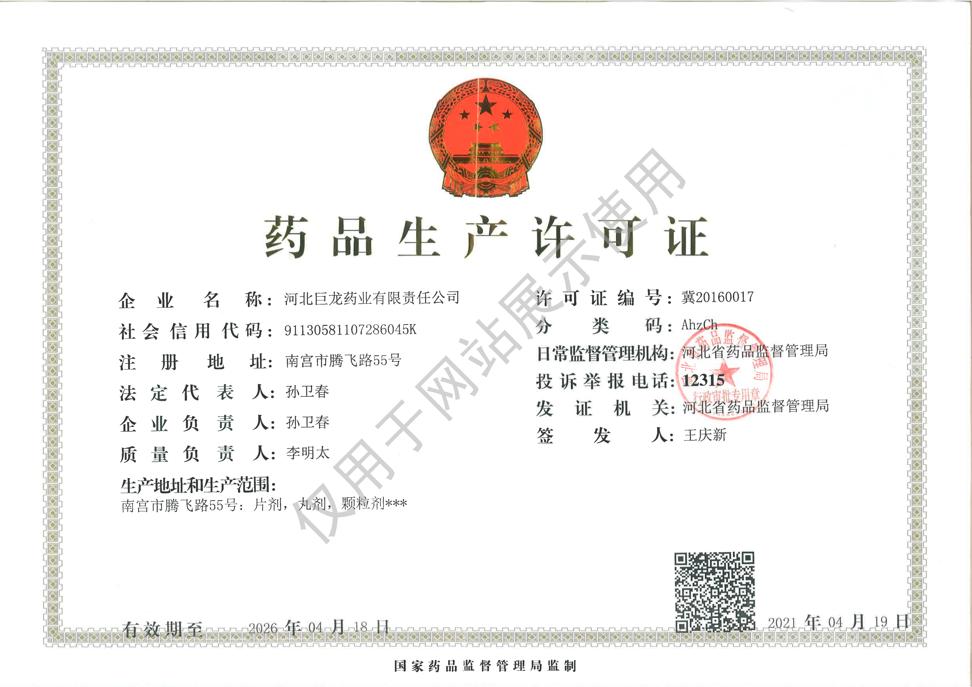 河北巨龍藥業(yè)有限責任公司,位于南宮市東部工業(yè)聚集區(qū),是一家集生產、銷售、科研為一體的中、西藥品生產企業(yè);是河北省醫(yī)藥行業(yè)協會主席團企業(yè)、省高新技術產業(yè)化示范企業(yè)、省誠信企業(yè)、省高新技術產業(yè)協會理事、省著名商標企業(yè),南宮市的一家藥品生產企業(yè)。其前身南宮市制藥廠,1973年建成并投產,1996年依法破產,1999年改制重建成股份制企業(yè)。2005年由河北鑫春建筑建材有限責任公司整體買斷收購,其后陸續(xù)注入資金2000多萬元,開發(fā)并上市了原國家中藥四類新藥(獨家品種)小兒清肺顆粒,被認定為省高新技術產業(yè)化示范基地。2015年企業(yè)通過新版藥品GMP認證。